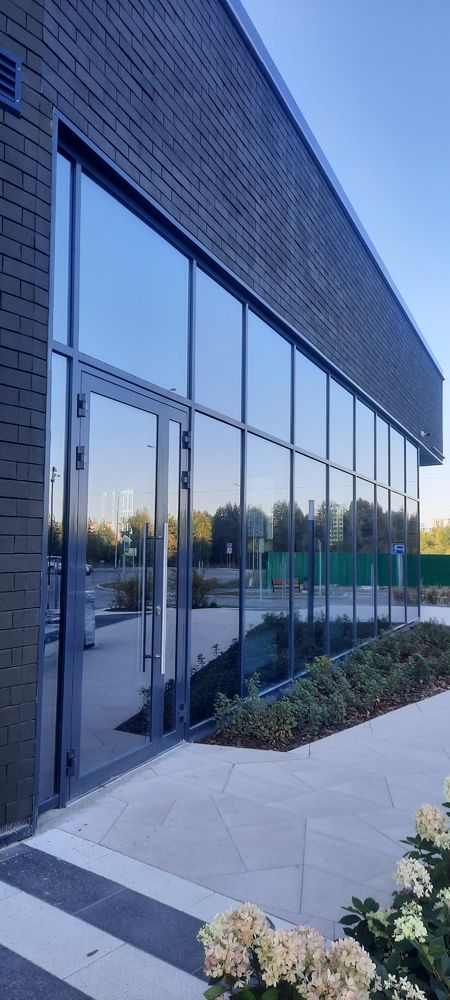 Наружные теплые алюминиевые витражи Инициал стоечно-ригельная система F50+ со встроенными оконными и дверными створками W62. Система F50+ обеспечивает высокую теплоизоляцию и элегантный внешний вид, а встроенные створки W62 добавляют удобство и функциональность, позволяя легко регулировать доступ свежего воздуха.