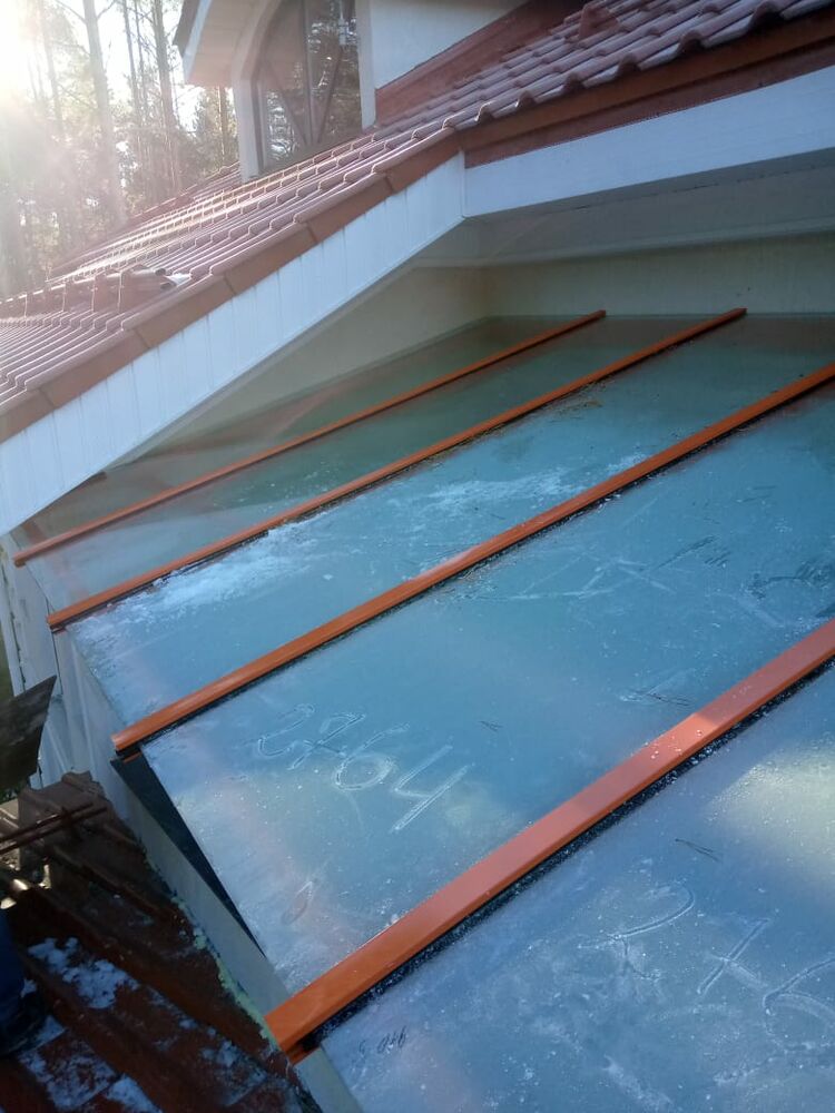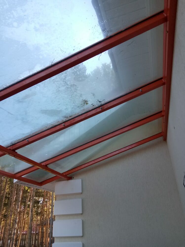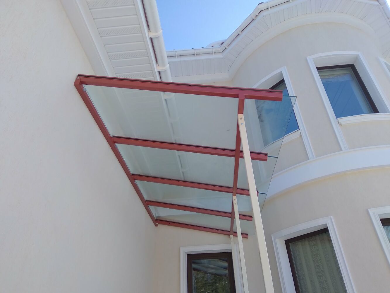 В городе Тюмень для частного дома изготовлены по индивидуальным замерам и смонтированы козырьки из закаленного стекла триплекс на металлическом каркасе. Стеклянные козырьки служат надежной защитой от снега и дождя.
