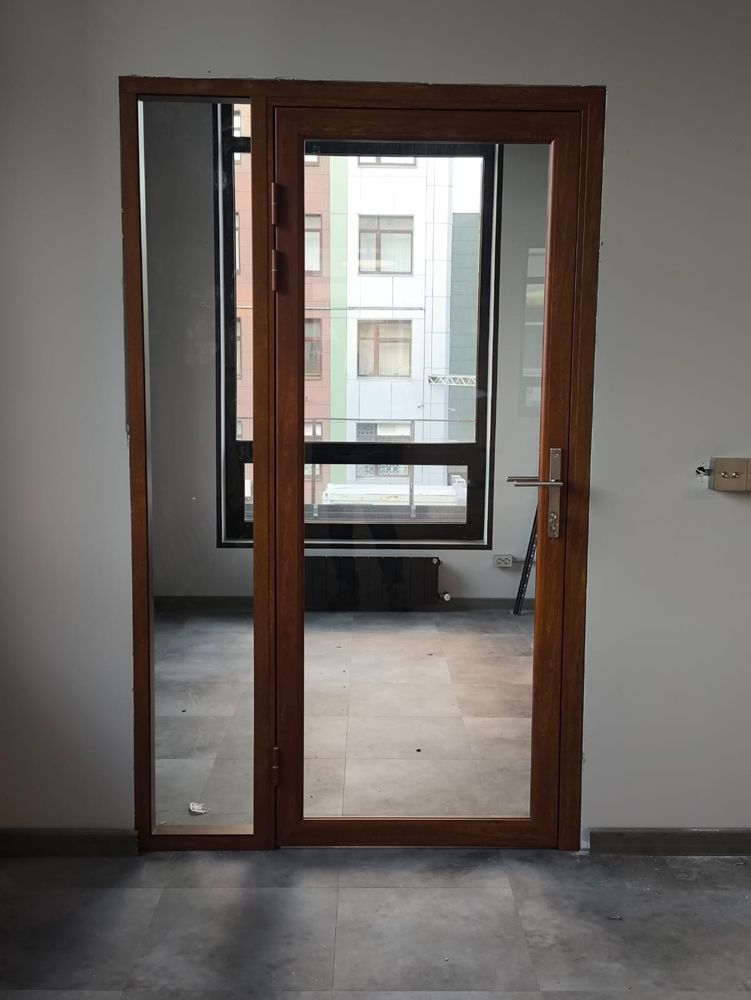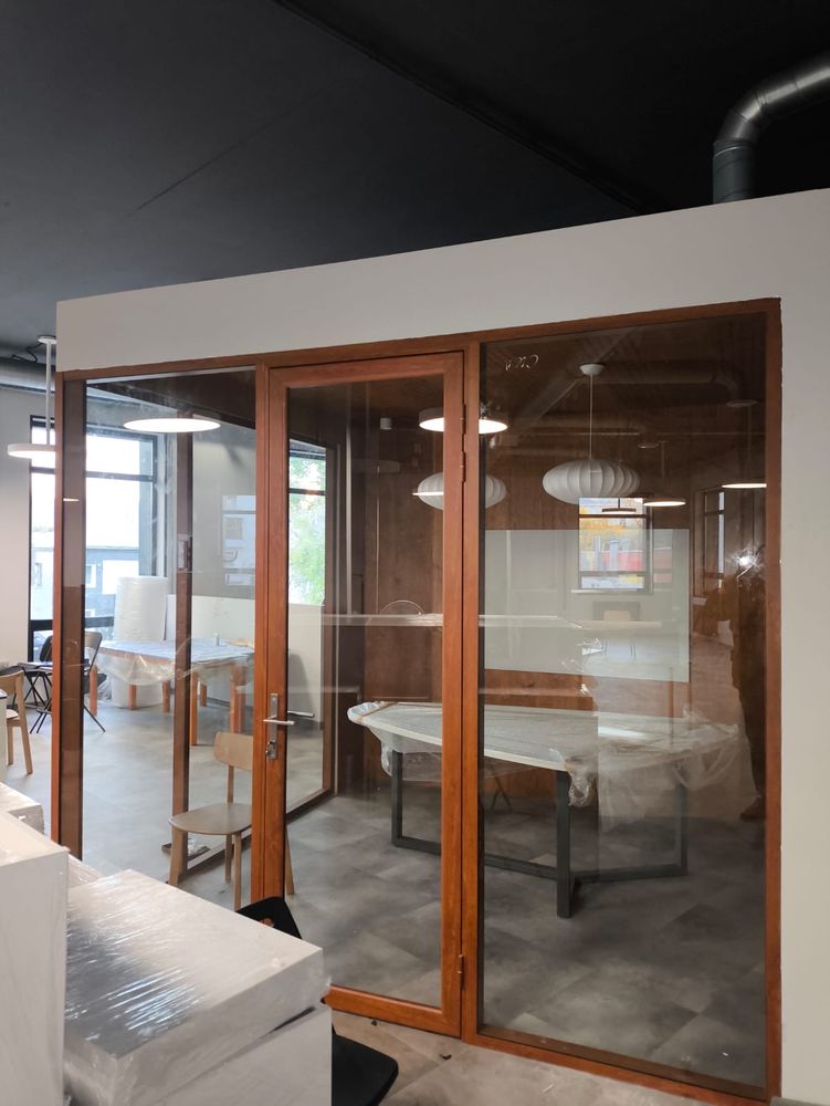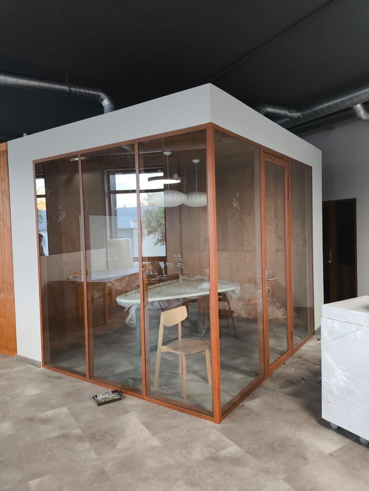 Перегородки выполнены из алюминиевого профиля, заполнение стекло закаленное прозрачное 8 мм. Двери Наяда Vitrage I, остекленные, распашные. Профиль в перегородках окрашен по каталогу Ral под дерево. Этот вариант идеально подходит для тех, кто хочет добавить натуральный и теплый акцент в офисный интерьер. Такой подход позволяет легко сочетать перегородки и двери с другими элементами оформления, создавая гармоничное пространство.