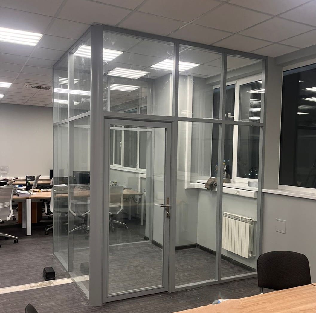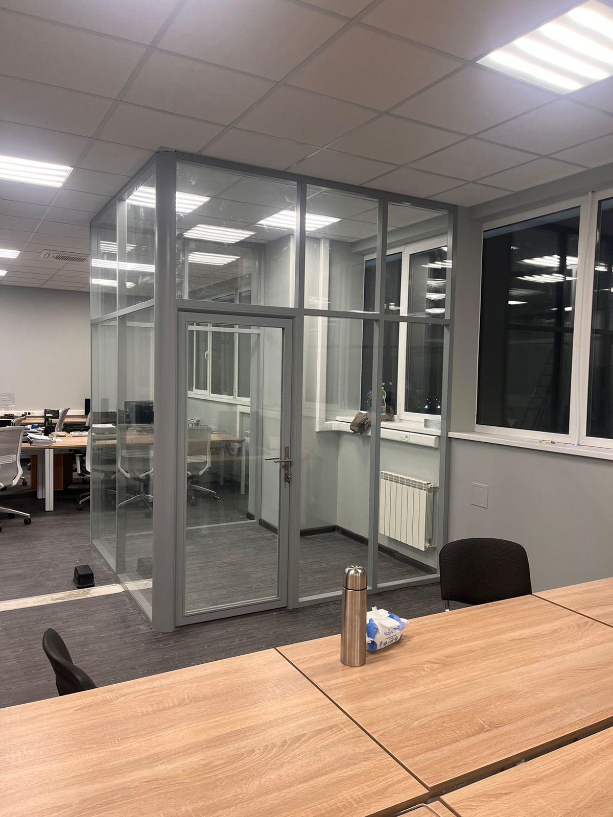 По периметру стеклянных перегородок используется алюминиевый профиль. Алюминий — это материал, который не только легок, но и отличается высокой коррозионной стойкостью и долговечностью. Профиль может быть окрашен по каталогу RAL на выбор заказчика, что позволяет интегрировать перегородки в любой дизайн интерьера.